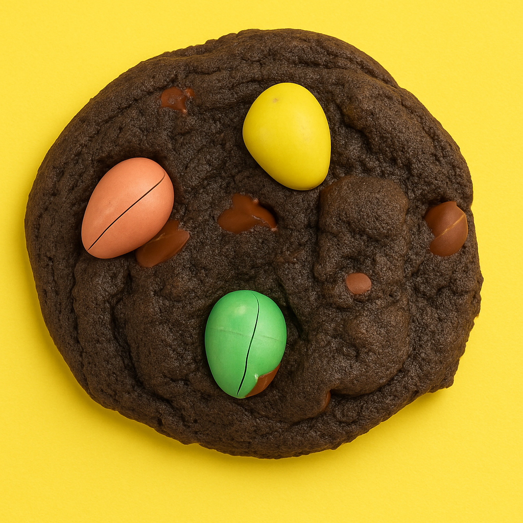 Chocolate cookie base filled with semi-sweet and milk chocolate chips and topped with mini eggs